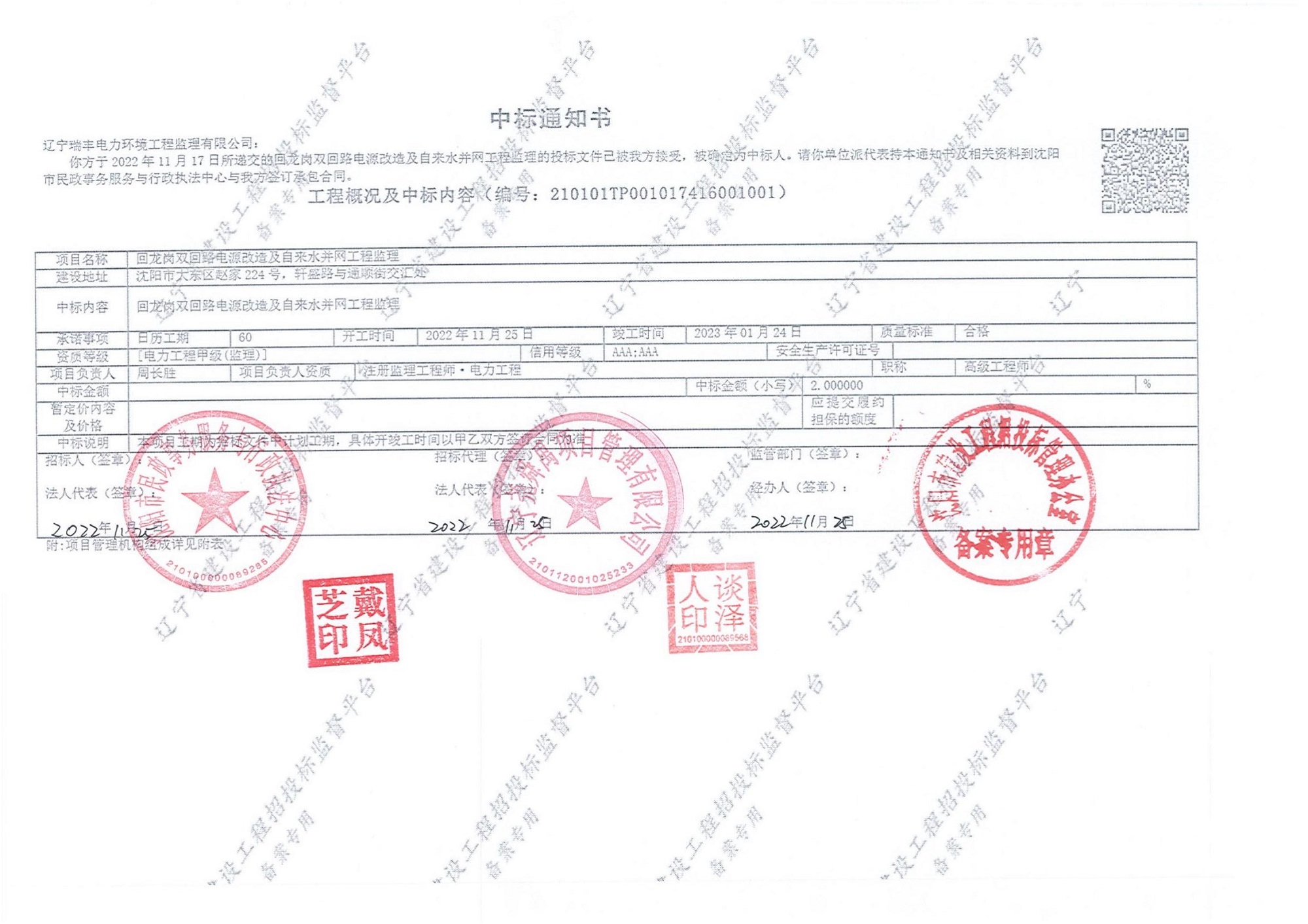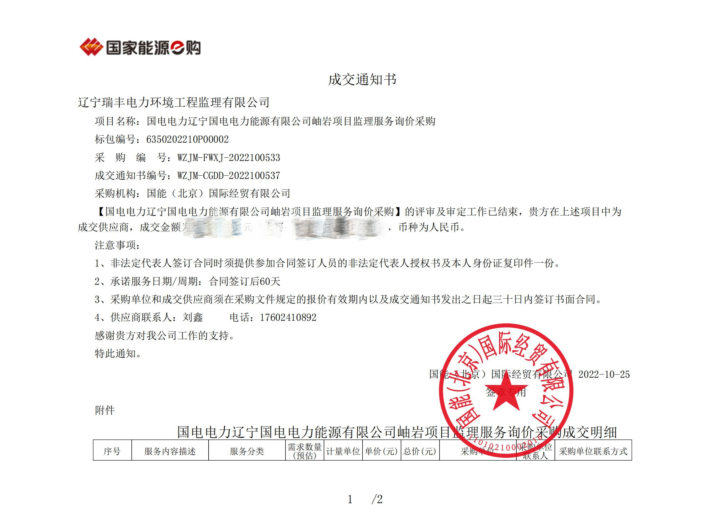遼寧瑞豐電力環(huán)境工程監(jiān)理有限公司于2022年10月20日與鞍山國電電力新能源有限公司簽訂了《國電電力遼寧岫巖整縣光伏發(fā)電一期農(nóng)光、漁光互補(bǔ)項(xiàng)目》監(jiān)理合同。